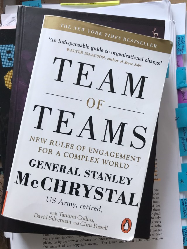 Last thoughts: This book is really interesting reading for anyone in an organisation that has multiple departments or teams which are siloed off but at times have to work together. McChrystal shows that in order to a achieve his objective it was necessary to breakdown communication barriers and trust an interconnected web of teams to share information and act upon it.